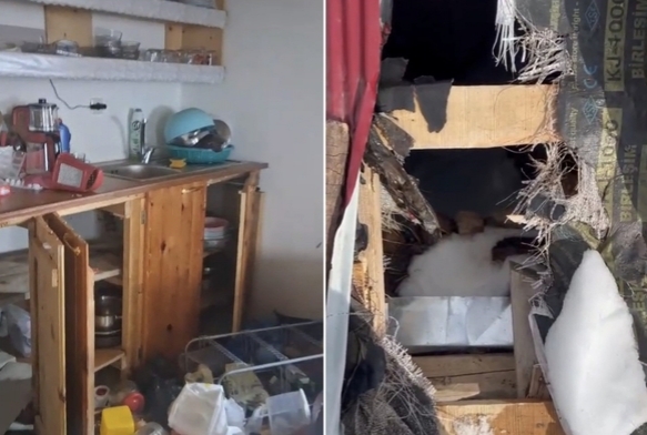 Aç kalan ayıların kar kütlesinin evi kaplaması ile eve çatıdan girdiğini belirten Trabzon'un Beşikdüzü ilçesi Yenicami mahallesi sakinlerinden Kadir Hışım, o anları cep telefonu ile görüntülerken, kapıdan giremediği eve çatıdan giren ayının evden dışarıya çıkamayınca evde ciddi derecede zarar verdiğini söyledi.