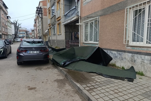 Bursa'nın İnegöl ilçesinde gece saatlerinde etkili olan lodos, bir apartmanın çatısındaki şıngılı yerinden sökerek park halindeki aracın üzerine savurdu. Olayda can kaybı yaşanmazken araçta maddi hasar meydana geldi.
