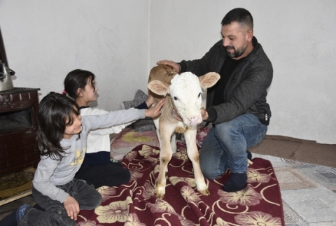 Bitlis'in Tatvan ilçesinde hasta buzağını eve alan sahipleri biberonla besleyip evde sobanın yanında bakıma al...