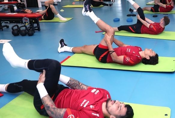 İki gruba ayrılan futbolcular, fitness salonunda mobilizasyon ve kuvvet çalışması yaptıktan sonra, antrenmanın ikinci bölümü için sahaya geçti. Teknik Direktör Stefan Kuntz yönetiminde yapılan teknik ağırlıklı saha antrenmanında, dar alanda pas ve duran top çalışmalarının üzerinde duruldu. Antrenmanın bir bölümünde konsantrasyon ve reaksiyon artırmaya dönük olarak gerçekleştirilen çalışmada Amerikan futbolu topu kullanıldı.