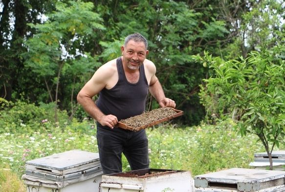 Hatay’ın Payas ilçesinde arıcılık yapan Üzeyir Yarar, hiçbir koruma önlemi olmadan kovanlara yaptığı bakımla adeta binlerce arıya meydan okuyor.