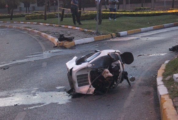 Öte yandan yaklaşık 15 metre ileride devrilen motosikletin ön tekerinin koptuğu ve kopan parçaların etrafa savrulduğu görüldü.