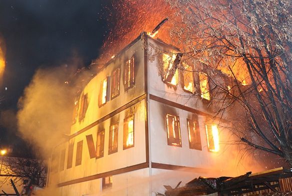 Karabük’ün Safranbolu ilçesinde 1850’li yıllarda yapılan 3 katlı tarihi konak alevlere teslim oldu. Geceyi aydınlatan alevler karşısında duramayan tarihi konağın büyük kısmı çökerken, itfaiye erleri ise duvar altında kalmaktan son anda kurtuldu. Alevlerin adeta göğe yükseldiği tarihi bina ise havadan görüntülendi.
