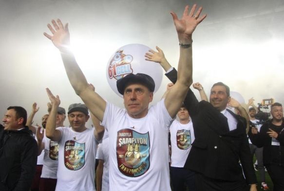 Öte yandan Abdullah Avcı’nın basın toplantısı sırasında bordo-mavili futbolcular ellerinde su şişeleri ile basın toplantısı odasına girerek teknik direktörlerini ıslattı ve onunla birlikte tezahüratlarda bulunarak şampiyonluğu kutladı.