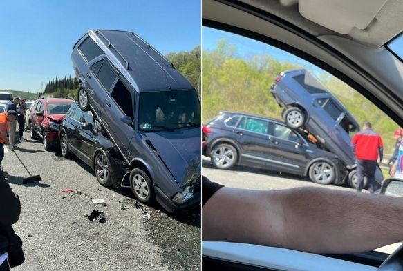 Bayram tatili sebebi ile yoğunluğun yaşandığı Anadolu Otoyolu Sakarya geçişinde meydana gelen 9 araçlı zincirleme trafik kazasında iki kişi yaralandı. İki aracın üst üste çıktığı kazayı görüp şaşkınlığını gizleyemeyenler dönüp bir daha baktı.