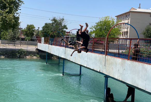 Adana'da sulama kanalına atlayan çocukların akrobatik hareketleri yürekleri ağızlara getirdi. Takla atarak kanala atlayan çocuklar, "Biz kimseden korkmayız. Yüzmeyi bilmeyenler boğuluyor" dedi.