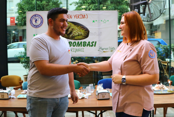 Adana'da düzenlenen tescilli 'Adana Bombası Yeme Yarışması' renkli görüntülere sahne olurken, 3 dakikada 8 tatlıyı yiyen genç, Cumhuriyet altını kazandı.