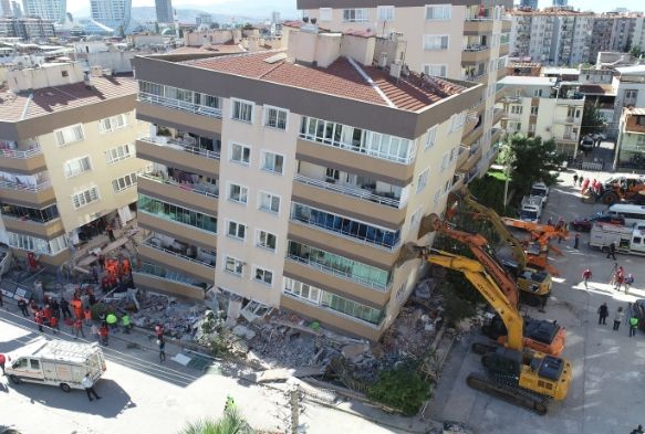 İzmir’de merkez üssü Seferihisar açıkları olan 6.6 şiddetindeki depreme dayanamayan binalar, iş makinalarının desteğiyle ayakta duruyor. Bayraklı ilçesindeki Barış Sitesinde 3 bina, Cumhuriyet Sitesinde ise 2 bina depremin şiddetine dayanamayarak yan yattı. Arama kurtarma çalışmalarının halen devam ettiği binalara, çökme tehlikesine karşı iş makinaları destek olurken, deprem faciasının yaşandığı o binalar havadan görüntülendi. Taşıyıcı kolonlardaki kırılmalar nedeniyle yan yatan binaların görüntüsü, deprem gerçeğini bir kez daha gözler önüne serdi.