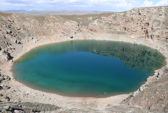 Sivas'ta bulunan ve güneşin konumuna göre renk değiştiren Kızılçan Gölü, soğuk havanın etkisiyle dondu. Sivas'ın en büyük krater göllerinden biri olan Kızılçan Gölü'nde kartpostallık görüntüler oluştu.