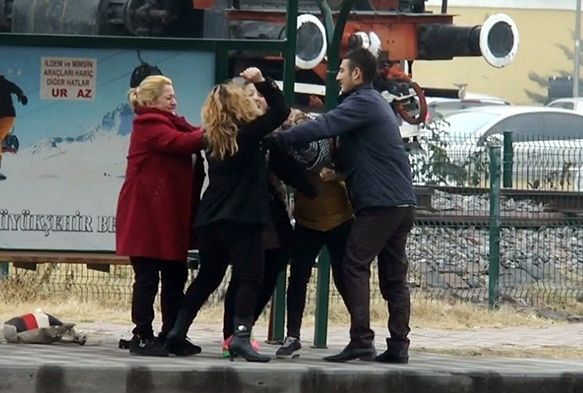 Edinilen bilgiye göre, Kocasinan Bulvarında bulunan tren garının önündeki otobüs durağında meydana gelen olayda 4 kadın ile 1 erkek arasında tartışma çıktı. Çıkan tartışma daha sonra kavgaya dönüşünce iki kadın birbirine tekme ve yumrukla saldırdı. Çevredekilerin şaşkın bakışlarıyla bir süre saç saça baş başa kavga eden iki kadın, daha sonra yanındakiler tarafından birbirlerinden ayrıldı. Kadıların kavgası kameralar tarafından da saniye saniye kaydedildi.