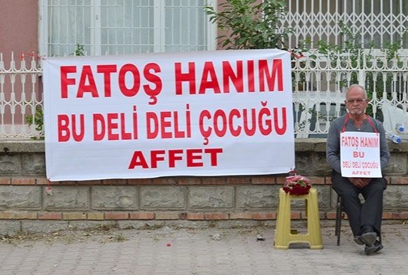 "Beni affedene kadar bekleyeceğim. Yoksa ben iyi değilim, çok seviyorum. İki kez aşık oldum bir kez sevdim. Affetmesini istiyorum. Sorunu aramızda çözmemiz lazım. Üçüncü bir kişi giremez aramıza. Daha beter olur. Ben bu eylemi yapıyorum kimsenin haberi yok. İşyerimi bıraktım geldim ben buraya. Kendisiyle tanışmamızda yine böyle bir eylem yapmıştım. Affedene kadar buradayım, helikopter kiralayıp gül atacağım damın üstüne. Affetsin başka birşey istemiyorum."