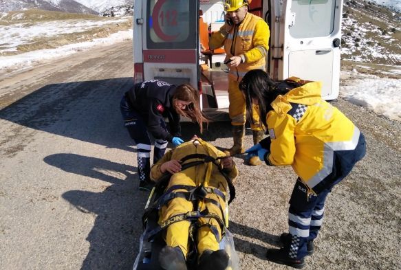 Kayseri'nin Yahyalı ilçesinde demir madeni ocağında çalışan Halil Suavi (53), iş makinesi ile maden çıkardıkları bölge arasında sıkışarak yaralandı.