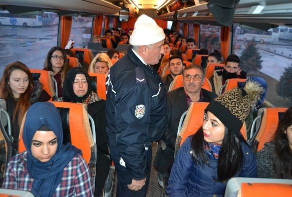 Trafik Denetleme Şube Müdürlüğü Otogar Büro Amirliği tarafından şehirlerarası otobüs terminalinden çıkan otobüslerin kış lastiği ile emniyet kemerleri kontrol edildi.