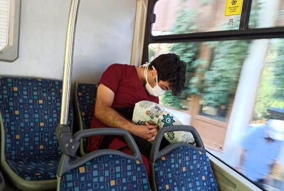 Malatya İnönü Üniversitesi Turgut Özal Tıp Merkezi'nde hemşire olarak görev yapan Ensar Büyükkaya'nın evine giderken otobüste yorgunluk nedeniyle uykuya yenik düştüğü anlar kameraya yansıdı. Görüntüler sosyal medyada ilgi gördü.