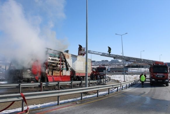 Kayseri'de yatak ve ahşap yüklü seyir halindeki tır yandı. Yangın, yaklaşık 1 saatlik çalışma sonucu söndürüldü.
