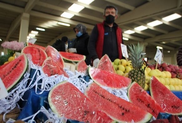 Sezonun ilk karpuzu pazar tezgahına yüksek fiyatla girdi. Kilosu 8 liradan satılan, tanesi ortalama 60 ile 80 TL'yi bulan karpuz, tüketicinin isteği üzerine çeyrek dilimlerle satılmaya başlandı.