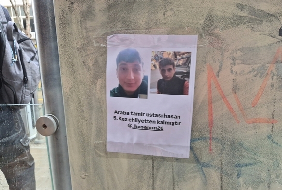 Eskişehir'de bir tramvay durağına asılan, "Araba tamir ustası Hasan, 5'inci kez ehliyetten kalmıştır" yazılı kağıt görenleri güldürdü.