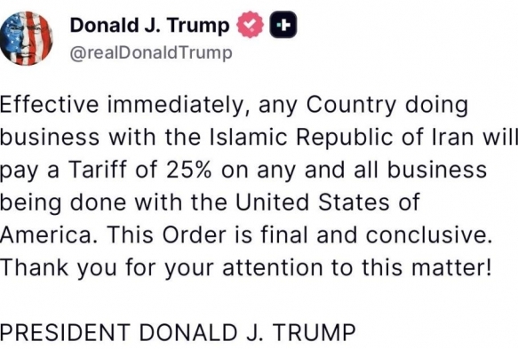 ABD Başkanı Donald Trump, İran ile iş yapan ülkelerin ABD ile gerçekleştirdiği her türlü ticari faaliyette yüzde 25 gümrük vergisi ödeyeceğini açıkladı.