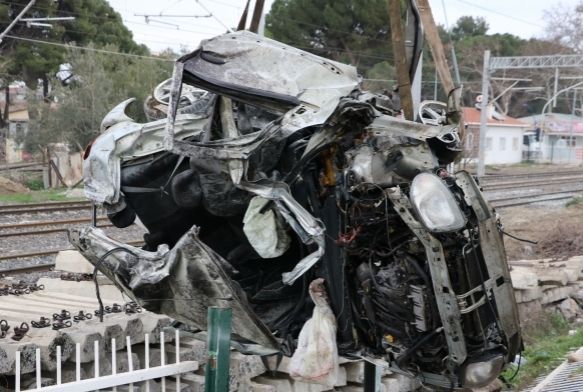 Karşıdan karşıya geçmeye çalışan 2 yayaya çarpan otomobil ardından tren istasyonu korkuluklarını kırarak traverslere çarptı